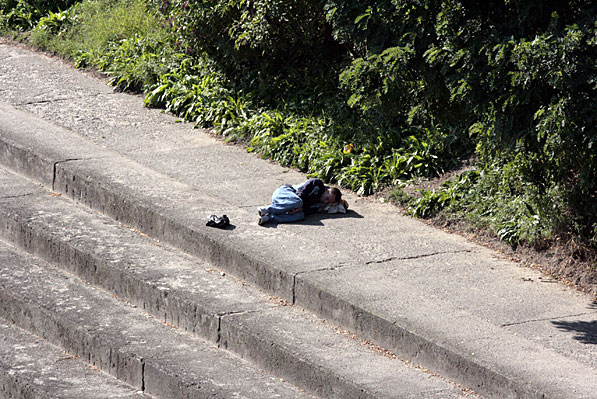 И главное,на асфальте прилёг,а не в кусты,которые рядом..;))И тапочки возле "кровати" аккуратно поставил..