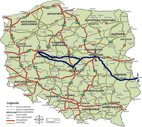 Вот наш маршрут по территории Польши (отмечен на карте синей линией):