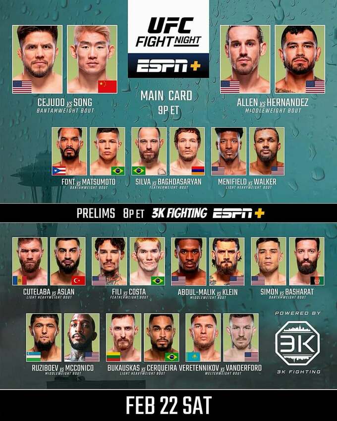 Предварительные бои стартуют 23 февраля в 1:00, основной кард запланирован на 04:00. Сехудо и Ядун выйдут в октагон ориентировочно в 06:00 по киевскому времени.