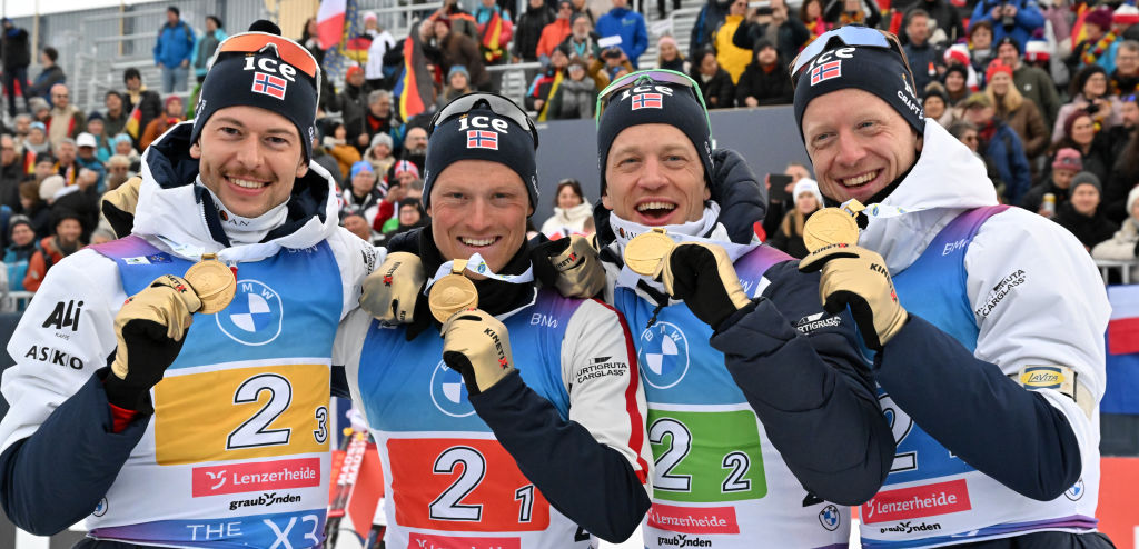 Но на этот раз Франция не смогла финишировать 1-й. Уже на первом этапе забойщик норвежской эстафеты Эндрю Стрёмсхейм захватил лидерство. Использовав лишь, на минуточку, рекордных четыре дополнительных патрона, Стрёмсхейм, Легрейд и братья Бё стали чемпионами мира! Стоит заметить, что лидер норвежской сборной Йоханнес Бё не использовал ни одного дополнительного патрона, поэтому на последнем круге, имея солидное преимущество, он устроил настоящее шоу. Хорошее окончание карьеры для двух легендарных братьев!