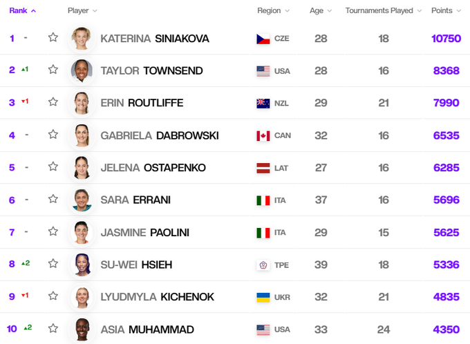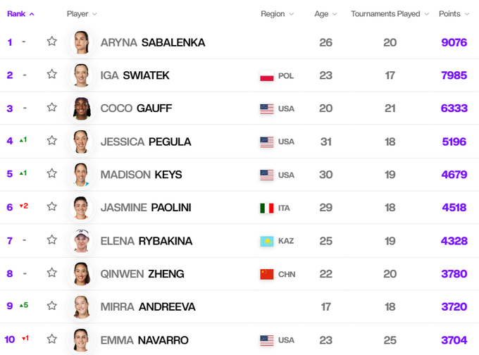 В гонке на Итоговый первое место продолжает занимать Мэдисон Киз. В топ-3 также Арина Соболенко и Ига Свентек.
