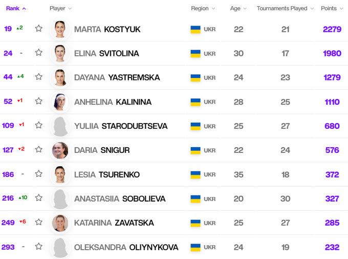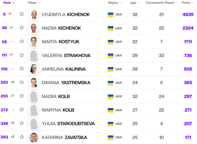 Элина Свитолина, Леся Цуренко (не играла в 2025) и Александра Олейникова сохранили свои позиции.