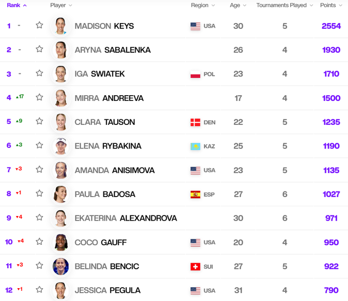 Мирра Андреева и Клара Таусон благодаря успешным выступлениям в Дубае находятся на 4-й и 5-й позиции. Елена Рыбакина идет шестой, а Аманда Анисимова и Паула Бадоса – седьмая и восьмая.