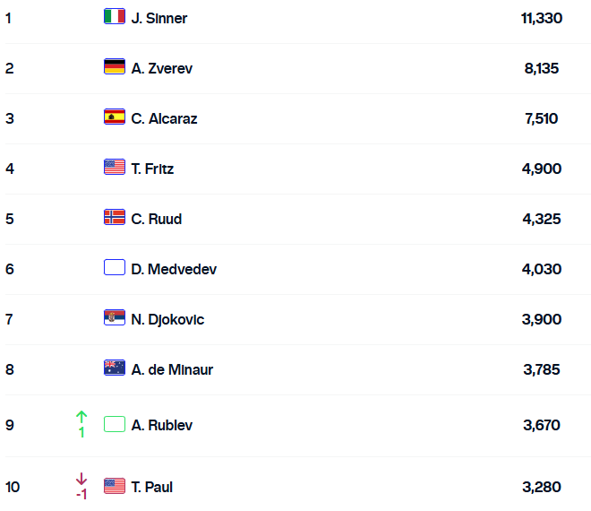 Янник Синнер остается первым номером, Андрей Рублев обошел Томми Пола