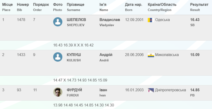 В тройном прыжке чемпионом стал Владислав Шепелев, который в лучшей попытке прыгнул на 16.43 метра, не оставив никому шансов. Серебро завоевал Андрей Кулиуш – 15,09 м, бронза у Ивана Фурдуя – 14,85 м.
