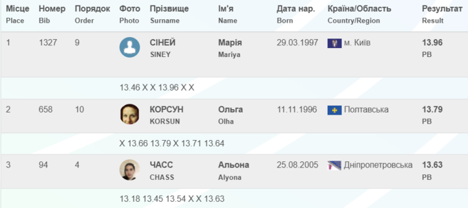 У женщин была ожесточенная борьба. Все три главные спортсменки соревновались на одном уровне и до последней попытки боролись за золотую награду. Лучшей стала Мария Синей – 13,96, второе место у Ольги Корсун – 13.79, а третья Алена Часс – 13,63.
