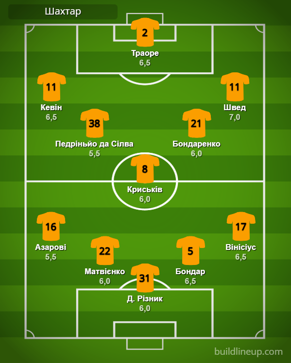 «Шахтер»: Д. Ризнык – Азарови (Педриньо Азеведо, 46), Матвиенко, Бондарь, Винисиус (Конопля, 71) – Педриньо да Силва (Назарина, 46), Крыськив, Бондаренко – Кевин, Траоре (Элиас, 62), Швед.
