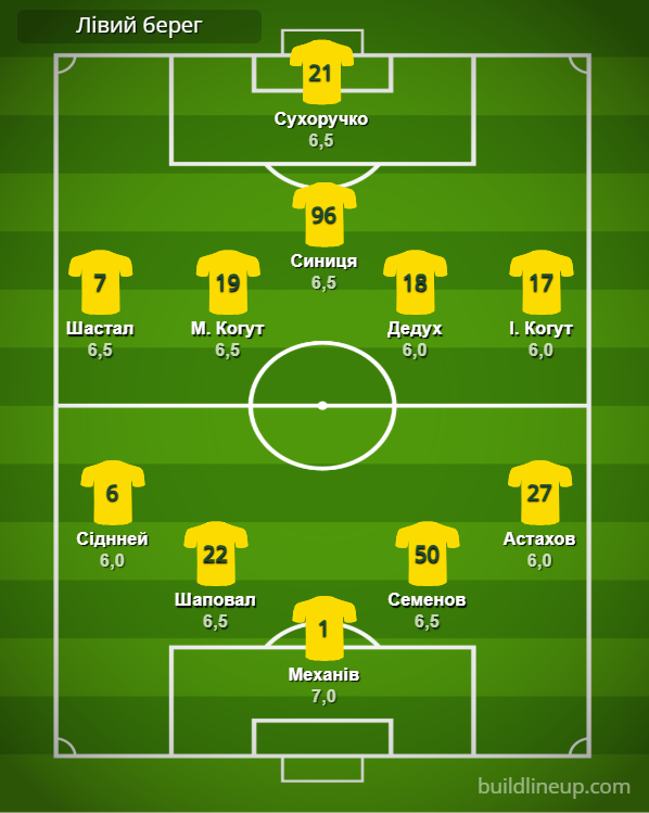 «Левый Берег»: Механов – Сидней, Шаповал, Семенов, Астахов – Шастал, Н. Когут (Приходько, 82), Синица (А. Ризнык, 82), Дедух, И. Когут (Галас, 82) – Сухоручко.