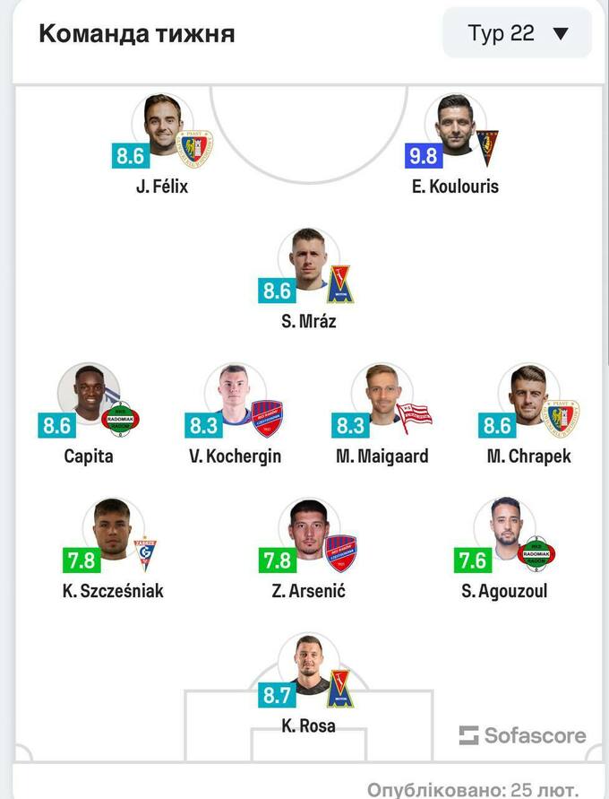 Стоит отметить, что это уже 4-е попадание Владислава Кочергина в символическую сборную тура этого сезона чемпионата Польши. На его счету 5 забитых мячей и 3 голевые передачи в 22 матчах турнира.