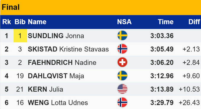 - 1. Йонна Сундлинг (Швеция) 3:03.36