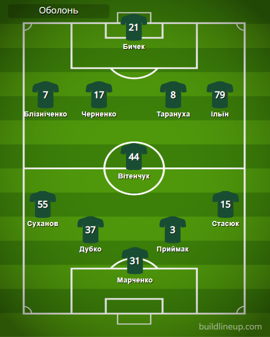 «Оболонь»: Марченко – Суханов, Дубко, Приймак, Стасюк – Витенчук (Курко, 90+3) – Близниченко (Прокопенко, 60), Черненко (Ломницкий, 90+3), Тарануха (Устименко, 75), Ильин – Бычек (Слободян, 75).