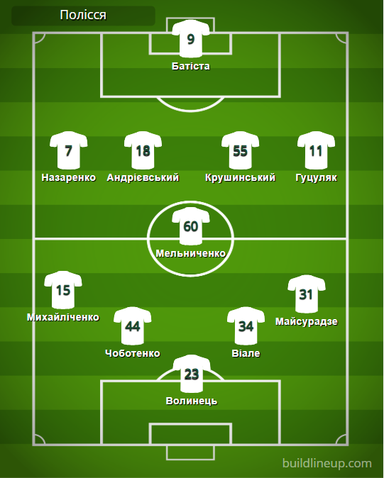 «Полесье»: Волынец – Михайличенко, Чоботенко, Виале, Майсурадзе (Тейлор, 73) – Андриевский, Мельниченко (Йосефи, 61), Крушинский (Гонсалвеш, 73) – Назаренко (Битон, 46), Батиста, Гуцуляк.