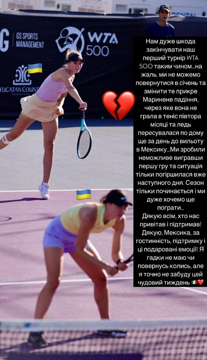 «Нам очень жаль заканчивать наш первый турнир WTA 500 таким образом... К сожалению, мы не можем вернуться в январь и изменить то неприятное падение Марины, из-за которого она не играла в теннис полтора месяца и едва передвигалась по дому за день до вылета в Мексику.