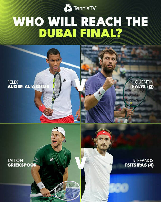1/2 финала пятисотника в ОАЭ: Таллон Грикспор (Нидерланды, ATP 47) – Стефанос Циципас (Греция, ATP 11), Кентен Алис (Франция, ATP 77) – Феликс Оже-Альяссим (Канада, ATP 21).