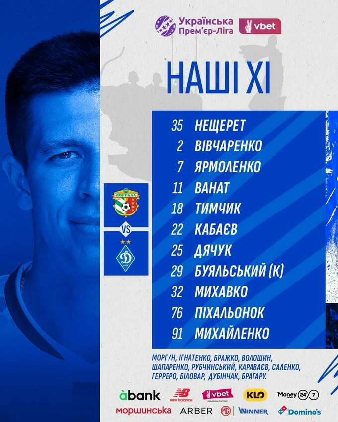 Динамо: Нещерет, Вивчаренко, Ярмоленко, Ванат, Тымчик, Кабаев, Дячук, Буяльский, Михавко, Пихаленок, Михайленко.