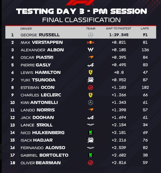 Последний день тестов Формулы-1. Итоговые результаты дня