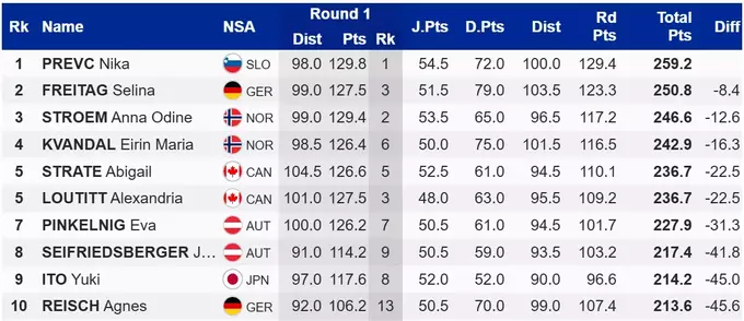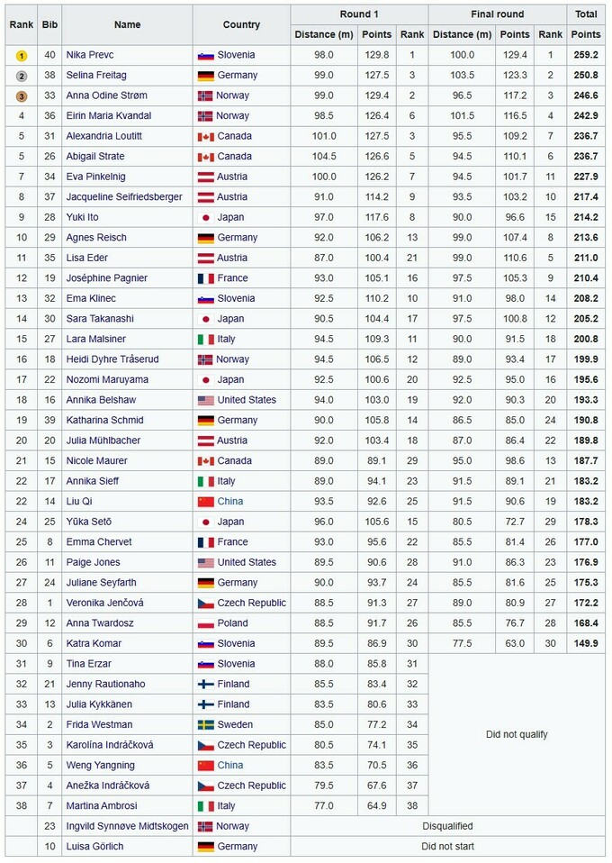 Впервые в своей карьере первой на чемпионате мира финишировала Ника Превц, завершившая соревнование, имея в активе 259.2 балла. Интересно, что спортсмена стала лучшей и в квалификации, и в первом раунде турнира.