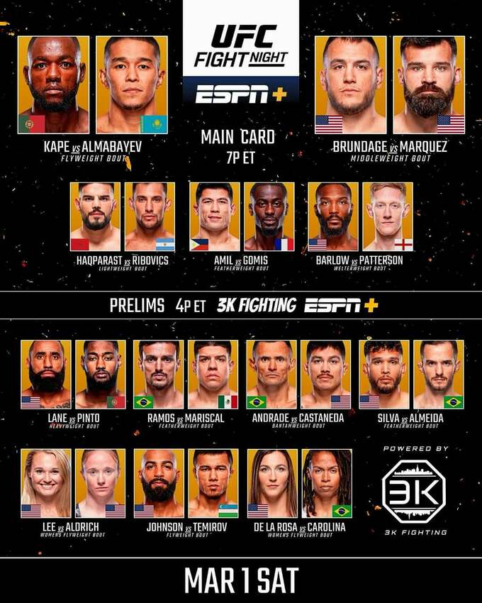 Предварительные бои стартуют 1 марта в 23:00, основной кард запланирован на 2 марта в 02:00. Капе и Алмабаев выйдут в октагон ориентировочно в 04:30 по киевскому времени.