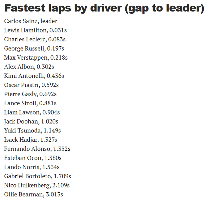 Интересно, что позиции в топ-3 заняли два пилота Феррари, а Льюис Хэмилтон был чуть быстрее Шарля Леклера. Действующий чемпион Макс Ферстаппен показал 5-е время.