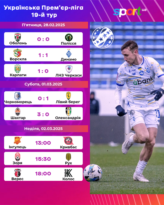 С 28 февраля по 2 марта проходят поединки 19-го тура Украинской Премьер-лиги 2024/25.