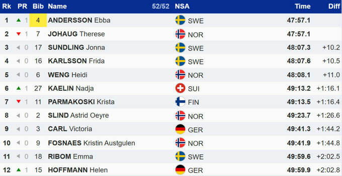 - 1. Эбба Андерссон (Швеция) 47:57.1
