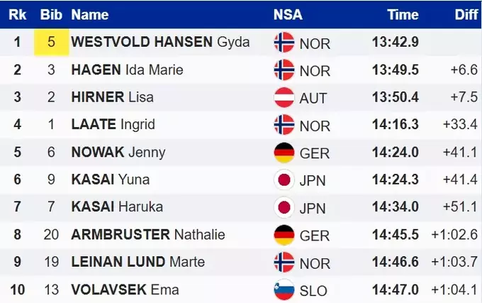 - 1. Гюда Вестволл Хансен (Норвегия) 13:42.9