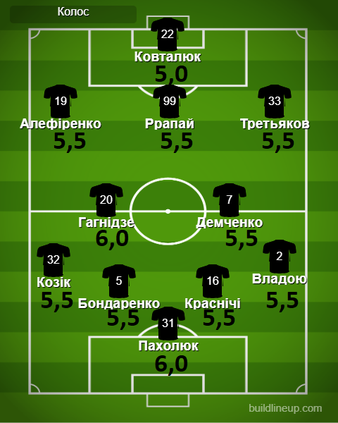 «Колос»: Пахолюк – Владою, Бондаренко, Красничи, Козик – Демченко, Гагнидзе – Третьяков, Ррапай, Алефиренко (Кузык, 90+4) – Ковталюк (Боливар, 62)