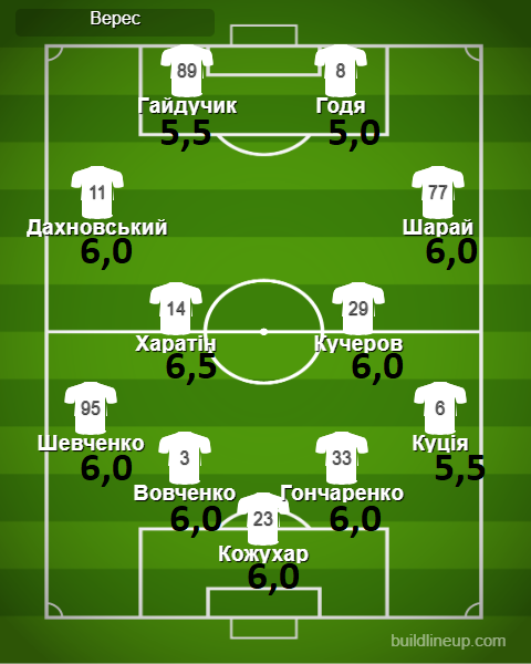 «Верес»: Кожухар – Куция, Вовченко, Гончаренко, Шевченко – Шарай (Смиян, 83), Харатин, Кучеров, Дахновский (Протасевич, 90+1) – Гайдучик (Степанюк, 83), Годя (Клец, 77)