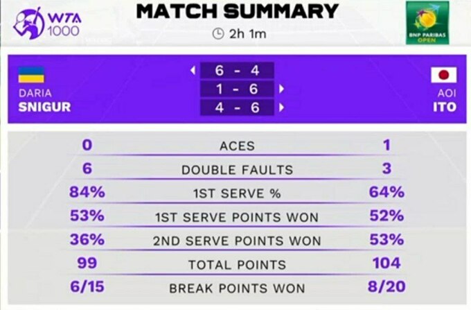 Дарья Снигур (Украина) – Аои Ито (Япония) [22] – 6:4, 1:6, 4:6