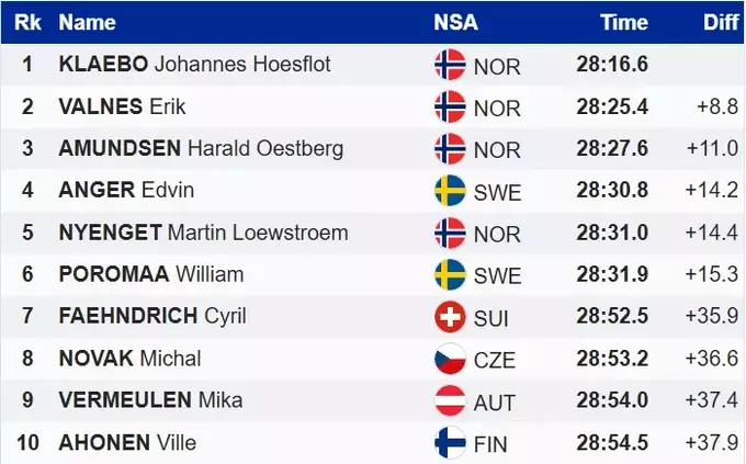 - 1. Йоханнес Клэбо (Норвегия) 28:16.6