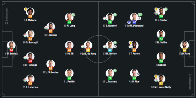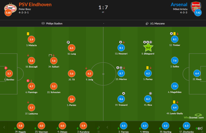 Украинский защитник «Арсенала» Александр Зинченко появился на поле на 71-й минуте, результативными действиями не отличился. Статистический портал SofaScore оценил игру украинца в 6.7 баллов из 10 возможных, Whoscored дал Александру оценку 6.3. Лучшим игроком матча по версии обоих порталов стал полузащитник гостей Мартин Эдегор. На его счету 2 гол, 1 ассист и оценки 9.2 и 9.4 соответственно.