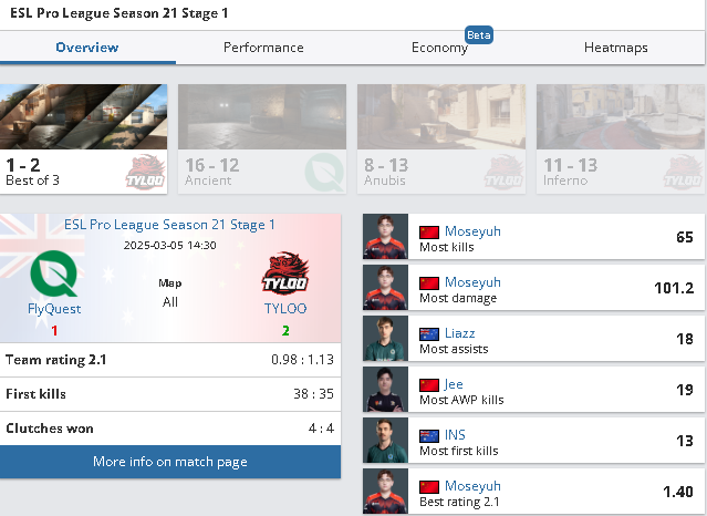 После того как TYLOO начали с 2:0, но затем проиграли два матча подряд, появились сомнения в их форме. Они лишь усилились после того, как FlyQuest выиграли карту Ancient (12:16), выбранную самими китайцами. Однако TYLOO смогли вернуться на Anubis (13:8), а затем довели дело до победы на Inferno в последнем раунде основного времени (13:11).
