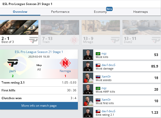 Бразильцы из paiN Gaming одолели Nemiga в напряжённой трёхкарточной серии (Train 7:13, Mirage 13:9, Dust2 13:11) и заняли предпоследнее место во второй стадии ESL Pro League S21.