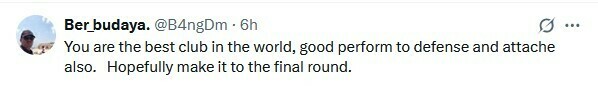 Ber_budaya: Вы лучший клуб в мире, хорошо играете в защите и нападении. Надеюсь, выйдете в финальный раунд.