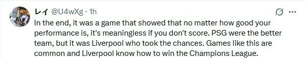 U4wXg: В конце концов, это был матч, который показал, что как бы хорошо ты ни играл, это бессмысленно, если ты не забиваешь. ПСЖ были лучшей командой, но именно Ливерпуль рискнул. Такие игры – обычное дело, и Ливерпуль знает, как выиграть Лигу чемпионов.