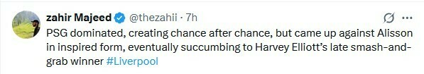 zahir Majeed: ПСЖ доминировал, создавая момент за моментом, но вышел против Алиссона в вдохновленной форме, в конечном итоге уступив из-за гола Харви Эллиотта.