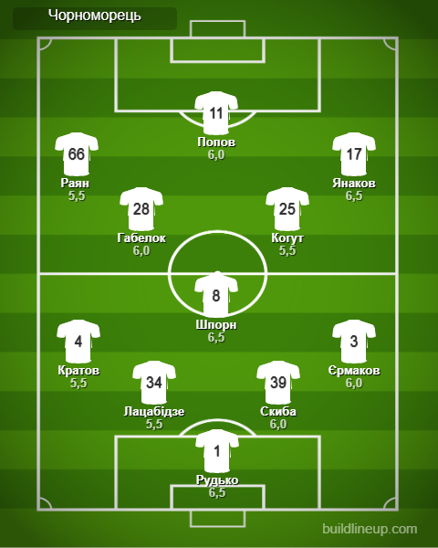«Черноморец»: Рудько – Кратов, Скиба, Лацабидзе (Кайо Гомес, 46) Ермаков – Шпорн (Райс, 69) – Райан (Бутко, 62), Габелок, Когут (Робакидзе, 74), Янаков – Попов (Тоиров, 62)