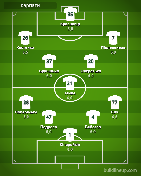 «Карпаты»: Кинарейкин – Полегенько, Педросо, Бабогло, Сыч – Бруниньо (Квасница, 80), Танда, Очеретько (Шах, 38) – Костенко (Чабан, 80), Краснопир (Игорь, 67), Пидлепенец (Федор, 67).