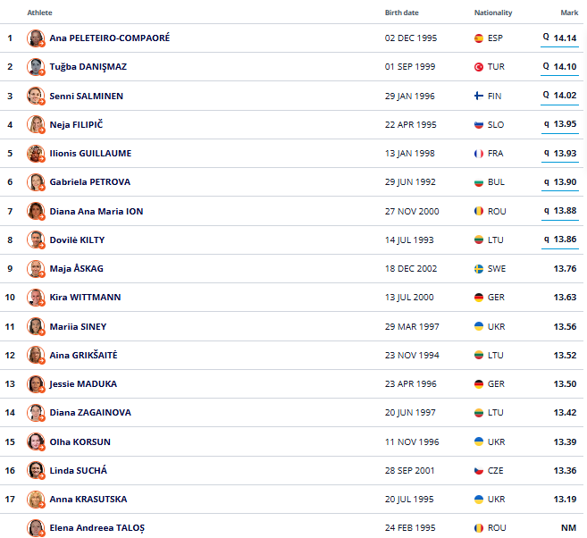 В квалификации первое место заняла Ана Пелетейро-Кампаоре (Испания), она прыгнула на отметку 14.14 метра.