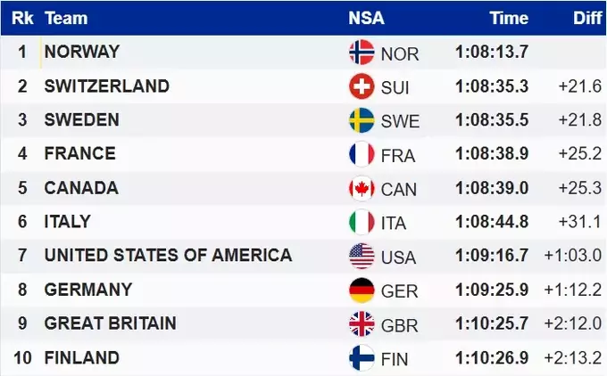 На второй позиции расположилась сборная Швейцарии (Сирил Фендрих, Йонас Бауманн, Джейсон Рюш, Валерио Гронд), тройку замкнули шведские лыжники (Трульс Гиссельман, Уильям Поромя, Йенс Бурман, Эдвин Ангер).