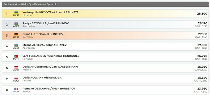 Первым упражнением у смешанных пар была динамика, за которую Кривицкая и Лабунец набрали 28.300 балла. Это на 0.13 балла больше, чем у азербайджанцев Разийи Сейилди и Агасифа Рахимова из Азербайджана, которые, однако, получили немного большую, чем украинцы оценку за трудность.