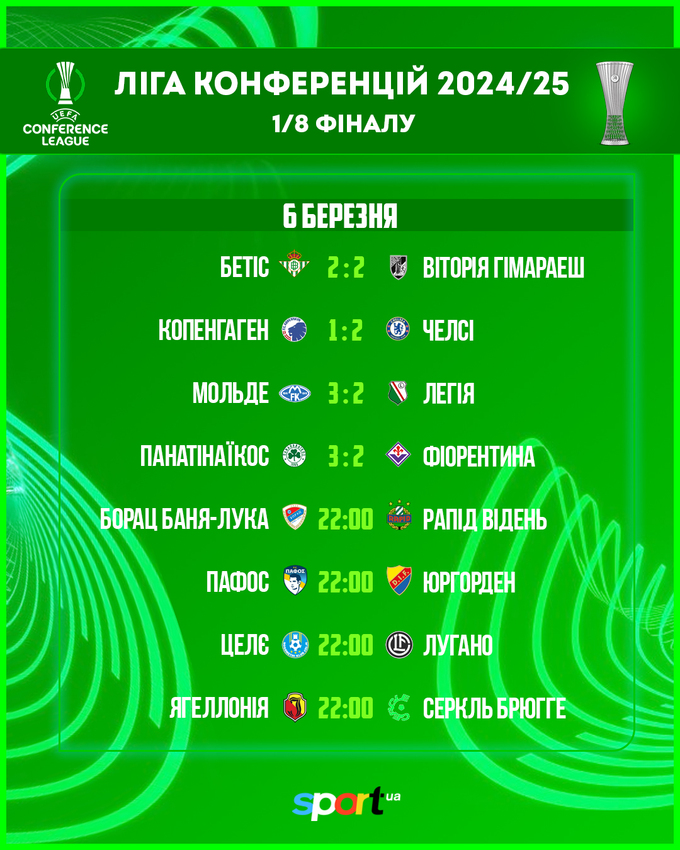 Вечером 6 марта проходят поединки 1/8 финала Лиги конференций.