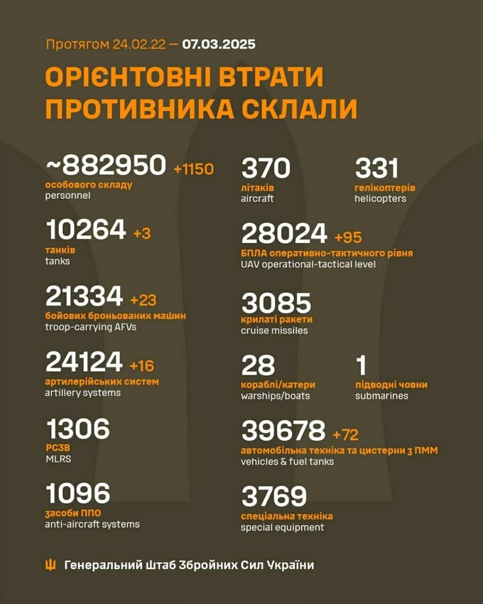 Предлагаем вашему вниманию сведение общих боевых потерь россии с 24.02.2022 по 07.03.2025.