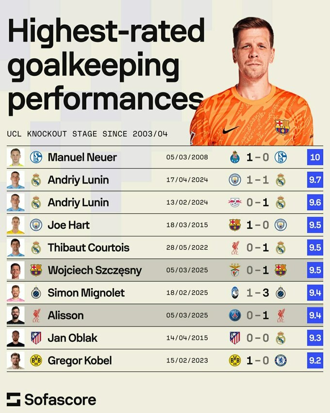 Вот как выглядит топ-10 рейтинга лучших выступлений вратарей в Лиге чемпионов по версии Sofascore: