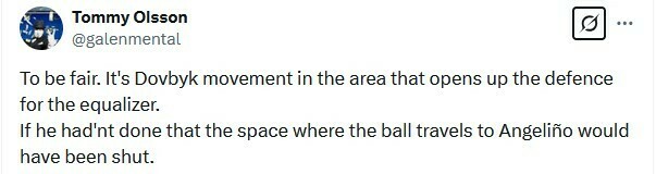 Tommy Olsson: Если честно. Именно движение Довбика в зоне открыло оборону. Если бы он этого не сделал, пространство, куда мяч попадает к Анхелиньо, было бы закрыто.
