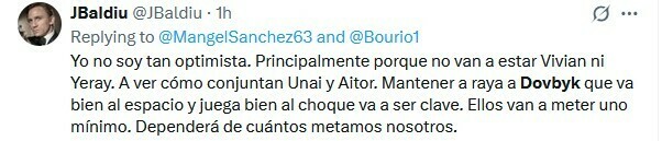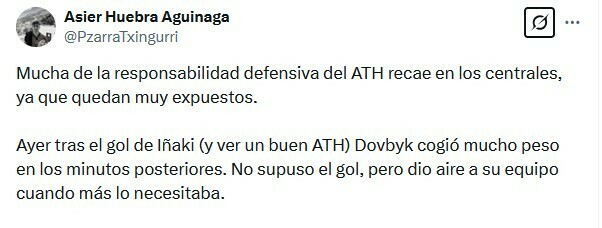 Asier Huebra Aguinaga: Большая часть ответственности за защиту ложится на центральных защитников, поскольку они очень уязвимы. Вчера после гола Иньяки, Довбик за следующие минуты сильно прибавил. Он не забил гол, но дал своей команде дыхание, когда она больше всего в этом нуждалась.