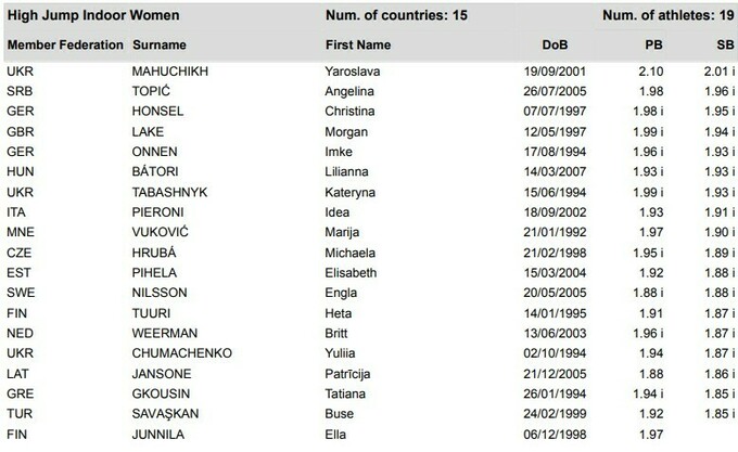 ЧЕ-2025. Прыжки в высоту. Женщины. Стартовый лист
