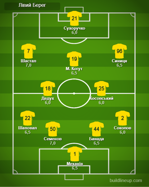 «Левый Берег»: Механив, Шаповал, Семенов, Банада, Соколов – Дедух, Косовский – Шастал (Галас, 79), Н. Когут (Войцеховский, 67), Синица (Ризнык, 86) – Сухоручко (Кобзарь, 79)