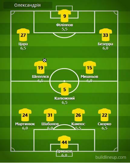 Заміни «Олександрії»: Козак – 5,5; Копина – б/о; Матеус – б/о; Кулаков – б/о; Ващенко – б/о.