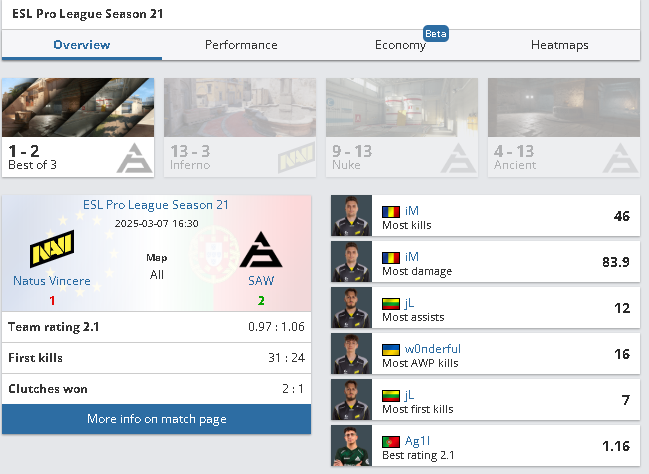 Сегодня стартовал групповой этап второй стадии ESL Pro League Season 21, и команда Natus Vincere начала с поражения. В своем первом матче они уступили SAW со счетом 1:2 (13:3 на Inferno, 9:13 на Nuke, 4:13 на Ancient).
